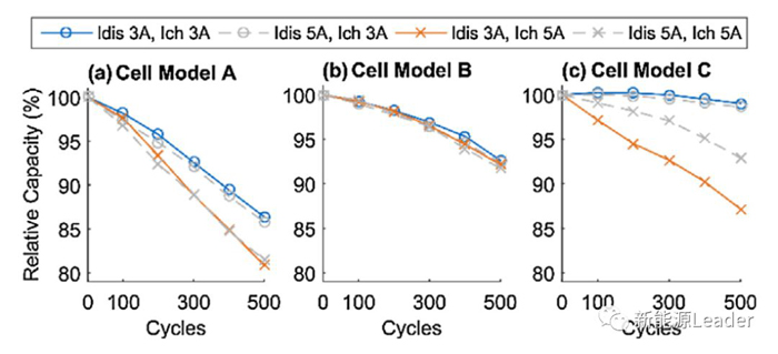 下圖為采用CCCV充電策略時不同的充電電流對于電池循環壽命的影響,從圖中能夠看到對于電池A,大充電電流會造成電池壽命的顯著下降,例如1A充電時電池的壽命可達1000次,3A充電時電池的壽命就會下降到800次,而充電電流達到5A時電池的壽命則僅為600次左右。但是對于電池B不同的充電電流對于電池的循環壽命并沒有顯著的影響。對于電池C在1A充電時電池循環1200次后容量保持率仍然可以達到97%,3A充電時電池循環1200次后容量保持率為95%,但是在5A充電時電池壽命會發生快速衰降,壽命不足700次。
